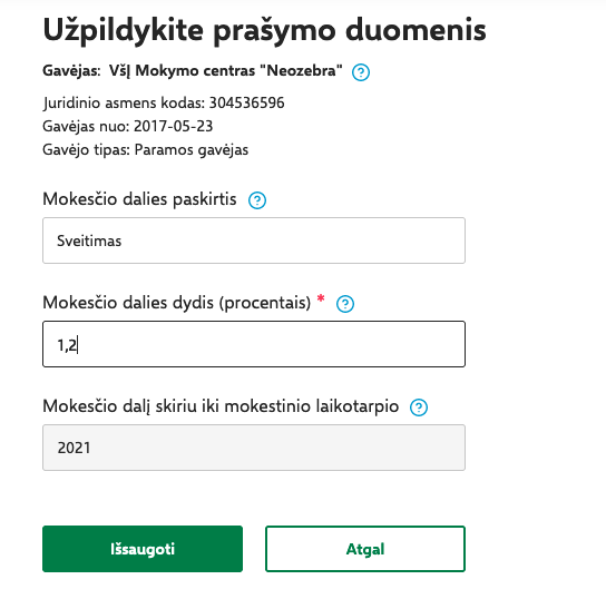 - В поле «Mokesčio dalies dydis (procentais)» укажите 1,2.