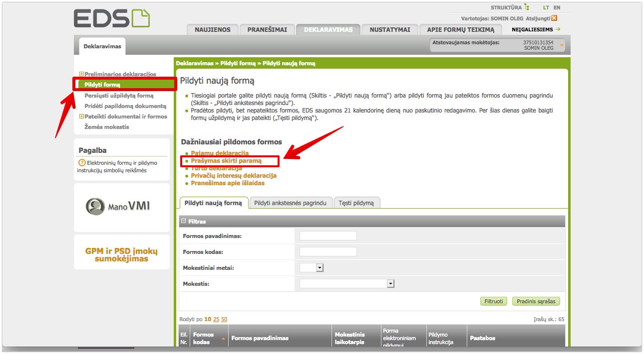 - Выберите «Prašymas skirti paramą» (Прошение о назначении пожертвования).